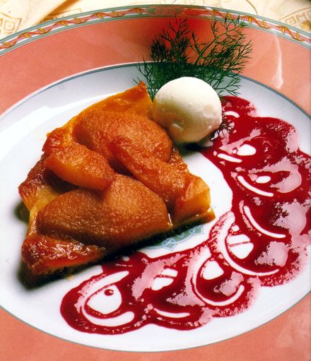 No prato de servir coloque um pouco de molho, uma fatia de tarte