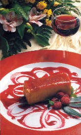 No prato de servir coloque um fundo de molho de framboesas e uma fatia